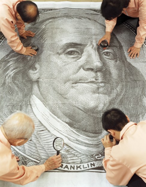 Les billets de cent dollars s’ornent du portrait de Franklin par l’artiste.