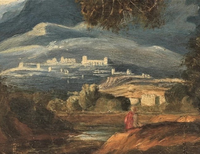 Au Quattracento, paix encore: on a découvert la beauté du champ de la vie quotidienne, on commence à le peindre, mais c’est parce qu’on croit que Dieu a voulu qu’on soit artiste avec lui, et qu’on parachève ces formes. Il faut le néoplatonisme pour que l’esprit, trop enthousiaste de la Beauté, perçoive l’imperfection, dans les réalités naturelles, tout autant qu’un reflet du monde céleste. Et va se dérouler alors une lutte magnifique, pendant deux siècles, pour sauver en peinture la valeur épiphanique du lieu comme il se trouve qu’il est, comme l’existence le donne. D’un premier petit paysage du lac Trasimène dans L’Annonciation de l’Angelico à Cortone aux campagnes romaines de Poussin et de Claude, c’est-à-dire avant qu’un frisson ne traverse -vent qui secoue le bouleau, foudre qui barre le ciel- les admirables tableaux de Gaspard Dughet, les peintres gardent assez de foi en un absolu signifié par la chose simple pour ne pas avoir à confier au dos cahotant de la mule sur le sentier de montagne, ou au hasard de la mer, cet alambic où ils cherchent à transmuter en esprit les données des sens.