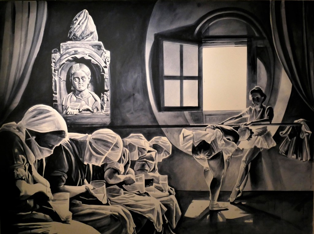 A Lyon, elle expose un ensemble de toiles qui rejouent des symboles traditionnellement associés à la fragilité, mais qui révèlent de multiples promesses de résistance et de force. Associant des images d’époques différentes, l’œuvre Genitæ Manæ nous questionne sur la vision du corps des femmes. Elle représente des effigies féminines au pouvoir à la fois protecteur et menaçant, comme autant de déesses obscures évoquées à l’occasion des accouchements dans l’Antiquité, mais aussi un objet, et un sujet, de désir via les traits de deux danseuses.