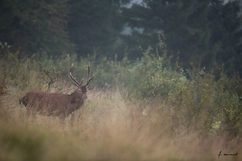 Le Rouge, parfois, voyait passer entre les arbres la silhouette glissante de l’animal qui l’accompagnait: un cerf aux lignes sèches et déliées, très grand, très sombre de pelage, évidemment un vieux mâle redoutable, aux bois semés d’andouillers nombreux. Un moment, dans une flaque de lune, il apparut en pleine clarté, et le Rouge le reconnut: c’était le cerf Pèlerin, le voyageur des nuits d’octobre, qui cette année encore, à travers des lieues de pays, revenait vers les étangs où l’attendaient les biches des Orfosses.