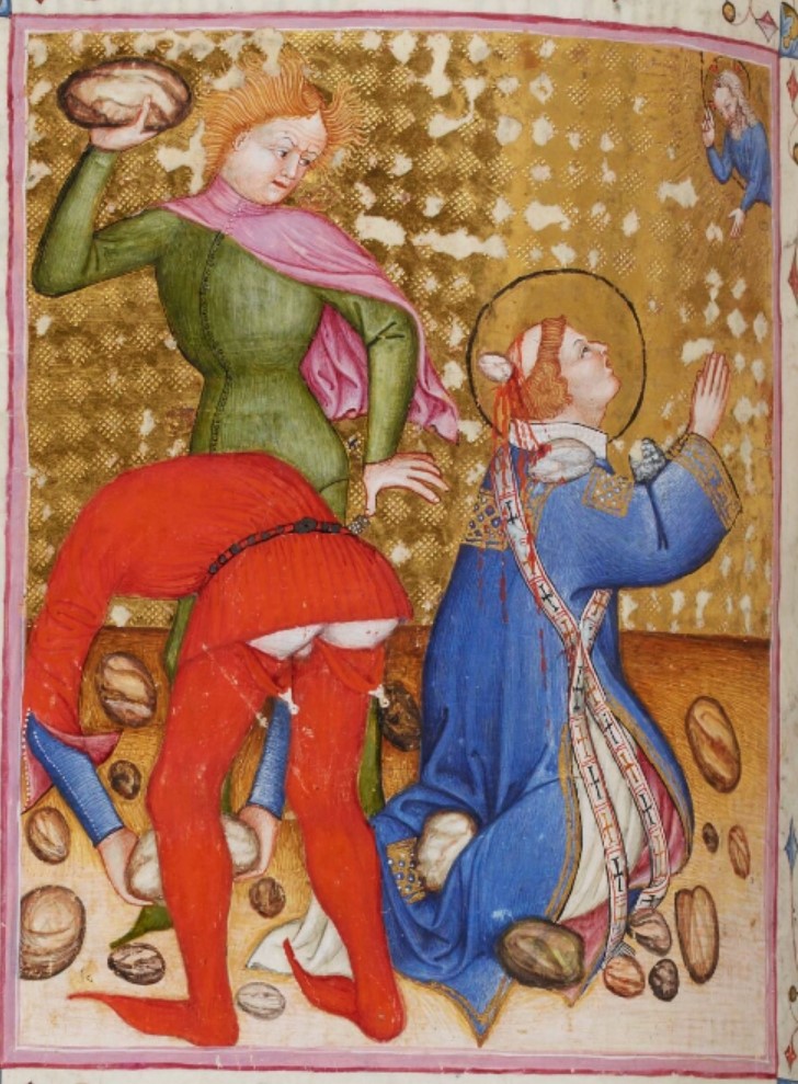 Une enluminure d’un missel franciscain du XIVe siècle [Paris, BN, ms. Lat. 757, f° 286 v] représentant la lapidation de Saint Étienne, premier martyr de la chrétienté, fêté le 26 décembre. On observe que, si Étienne est représenté avec ses habits liturgiques de diacre subissant son martyre dans une attitude de prière et de dignité parfaite, ce n’est pas le cas de ses bourreaux. Le personnage vêtu de vert a les cheveux hirsutes, ce qui va de pair avec ses traits grimaçants, et qui signifie le désordre intérieur d’un homme livré à la folie meurtrière. Quant au personnage tout vêtu de rouge écarlate, ses vêtements sont le dernier cri de la mode du XIVéme siècle, c’est-à-dire de très longues poulaines et un pourpoint très court auquel d’aucuns reprochent d’exposer trop de choses par devant comme par derrière. Ses chausses apparaissent en partie détachées, deux des aiguillettes sont dénouées, et tandis qu’il se penche pour ramasser une pierre, il nous présente son postérieur.
