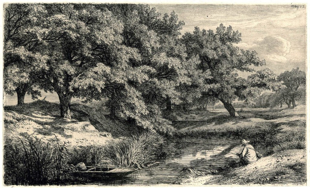 Après un long oubli, après la gravure d’apparat du premier Empire et de la Restauration, le romantisme avait retrouvé, avait reconquis l’eau-forte. Quelques artistes originaux s’étaient essayés avec succès à un procédé qui traduisait avec une fidélité si nerveuse et si colorée tous les caprices et toutes les brusqueries de l’inspiration pittoresque. L’un d’eux, très obscur, Eugène Bléry, vrai Sylvain, amoureux des beaux arbres robustes, solidement attachés au sol par de montueuses racines, fut le premier maître ou plutôt le professeur de Meryon. Il lui enseigna les éléments de l’art, la manière de tenir la pointe et de faire mordre l’acide. Dans quelques-unes des planches de Bléry, dans ses vues de Fontainebleau par exemple, ou dans ses grandes études de plantes, on constate une brillante rectitude de la taille, une franchise de morsure (morsure peu profonde, à vrai dire) qui sont d’un aquafortiste-né.
