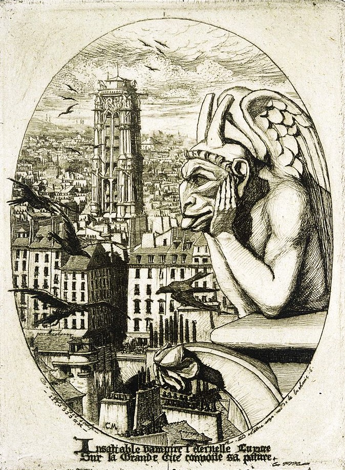 Meryon n’est pas pittoresque. Sobres, puissantes et pures, ses planches sont l’image de la stabilité. En elles, l’art ne s’attache pas à ce qui change et se déplace, à la fuyante magie des apparences, aux minutes impondérables. Il donne à la mélancolie des assises que rien n’ébranle, des assises carrées sur lesquelles la mort n’a pas de prise. L’accident n’y semble pas fortuit, mais inscrit à jamais. Il fait partie de l’intégrité des masses, il fut tracé par un dieu sévère, d’après de mystérieuses lois.
