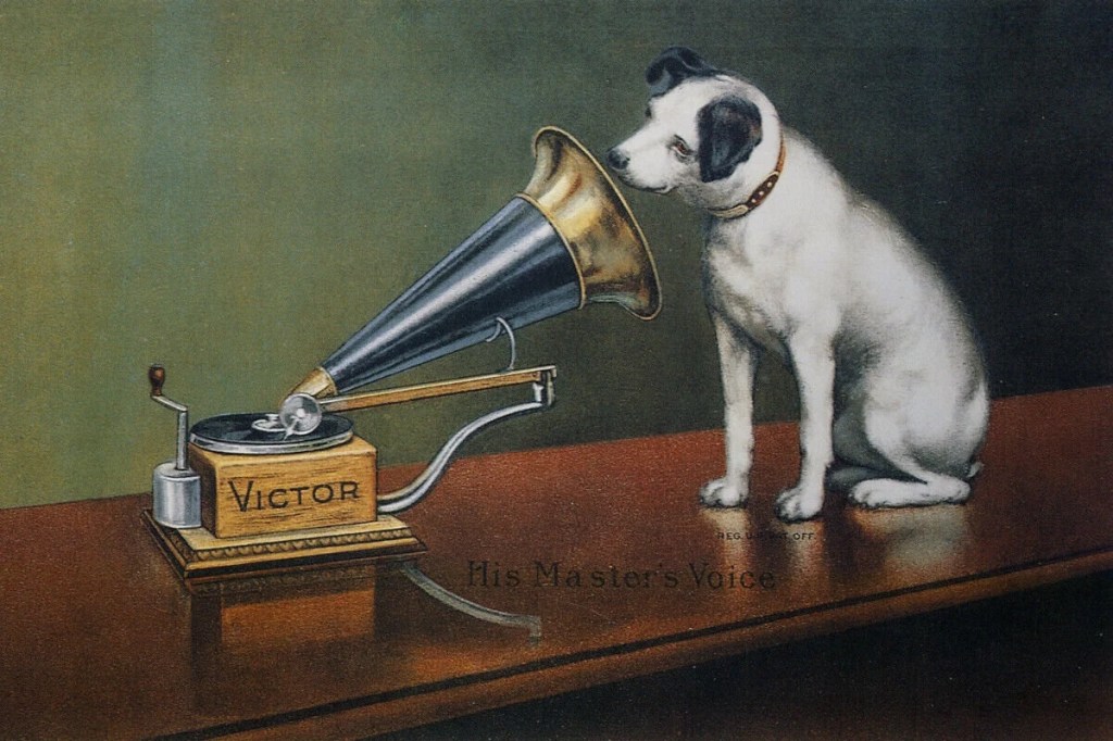 La technique phonographique permet donc de constituer une tombe résonnante à travers laquelle les vivants entretiennent la présence spectrale des morts. L’attitude du chien Nipper écoutant, devant le pavillon de l’appareil, la voix de son maître disparu rappelle que par delà la mort, le maitre reste là.