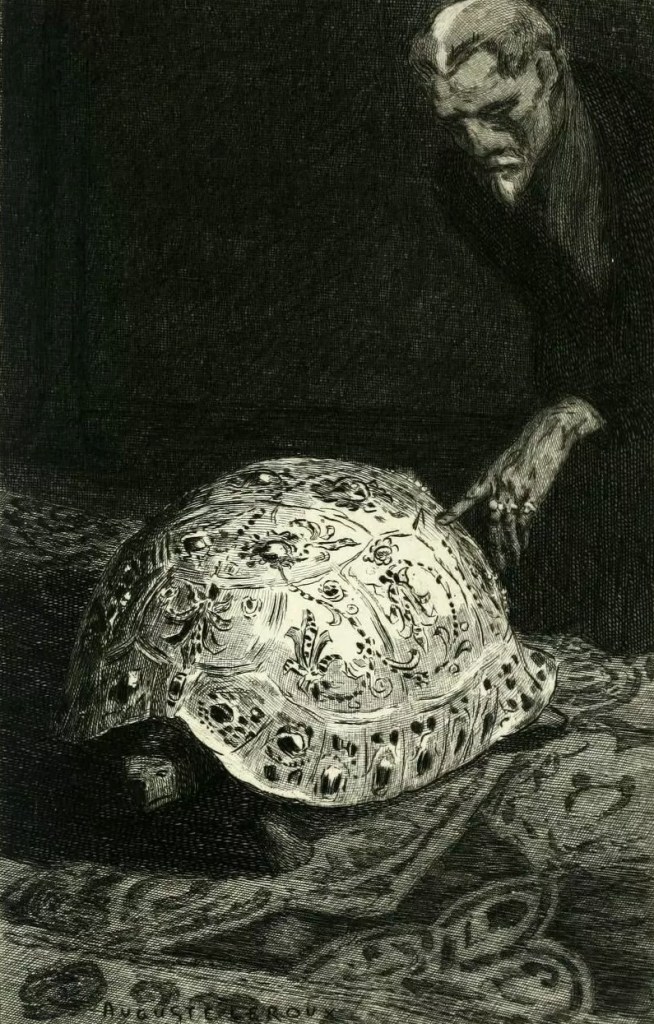 Cette tortue était une fantaisie venue à des Esseintes quelque temps avant son départ de Paris. Regardant, un jour, un tapis d’Orient, à reflets, et, suivant les lueurs argentées qui couraient sur la trame de la laine, jaune aladin et violet prune, il s’était dit: il serait bon de placer sur ce tapis quelque chose qui remuât et dont le ton foncé aiguisât la vivacité de ces teintes. Il se détermina, en conséquence, à faire glacer d’or la cuirasse de sa tortue.