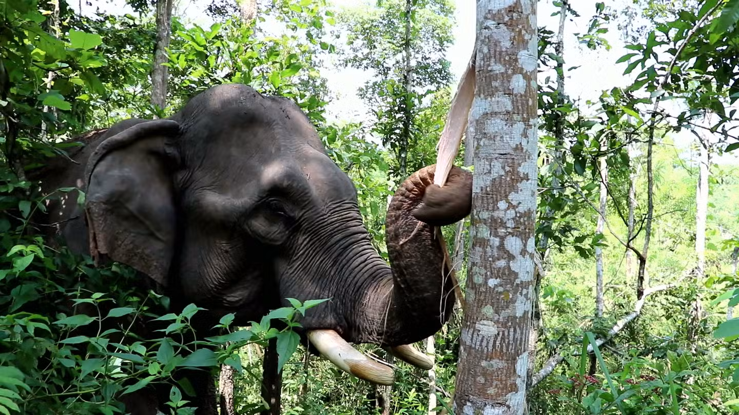Un éléphant souffrant d’une fracture et d’une plaie ouverte consomme l’écorce d’un spécimen de Canarium subulatum, un arbre connu notamment pour ses propriétés anti-inflammatoires, au Laos, 2022.