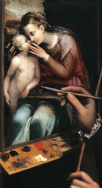 Sofosnibe se présente ici en artiste de cour: réserve et détermination, habit noir, sprezzatura. Une professionnelle -grande nouveauté, avis aux historiens du féminisme. Elle se peint peignant, et elle peint son pinceau sur la chair de l’Enfant: la même chair que la chair de sa mère.
